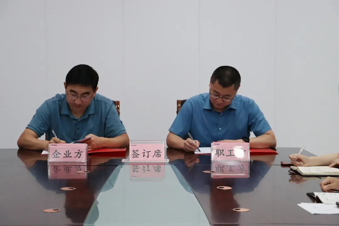 為構(gòu)建和諧穩(wěn)定的勞動(dòng)關(guān)系,充分發(fā)揮工會(huì)在企業(yè)健康發(fā)展中的監(jiān)督作用,切實(shí)維護(hù)勞動(dòng)者的合法權(quán)益。5月31日, 濱盛文旅集團(tuán)工會(huì)舉行“1+3”集體合同簽約儀式,集團(tuán)黨委委員、董事、副總經(jīng)理、工會(huì)主席吳振濤,黨委委員、副總經(jīng)理王棟出席簽約儀式。